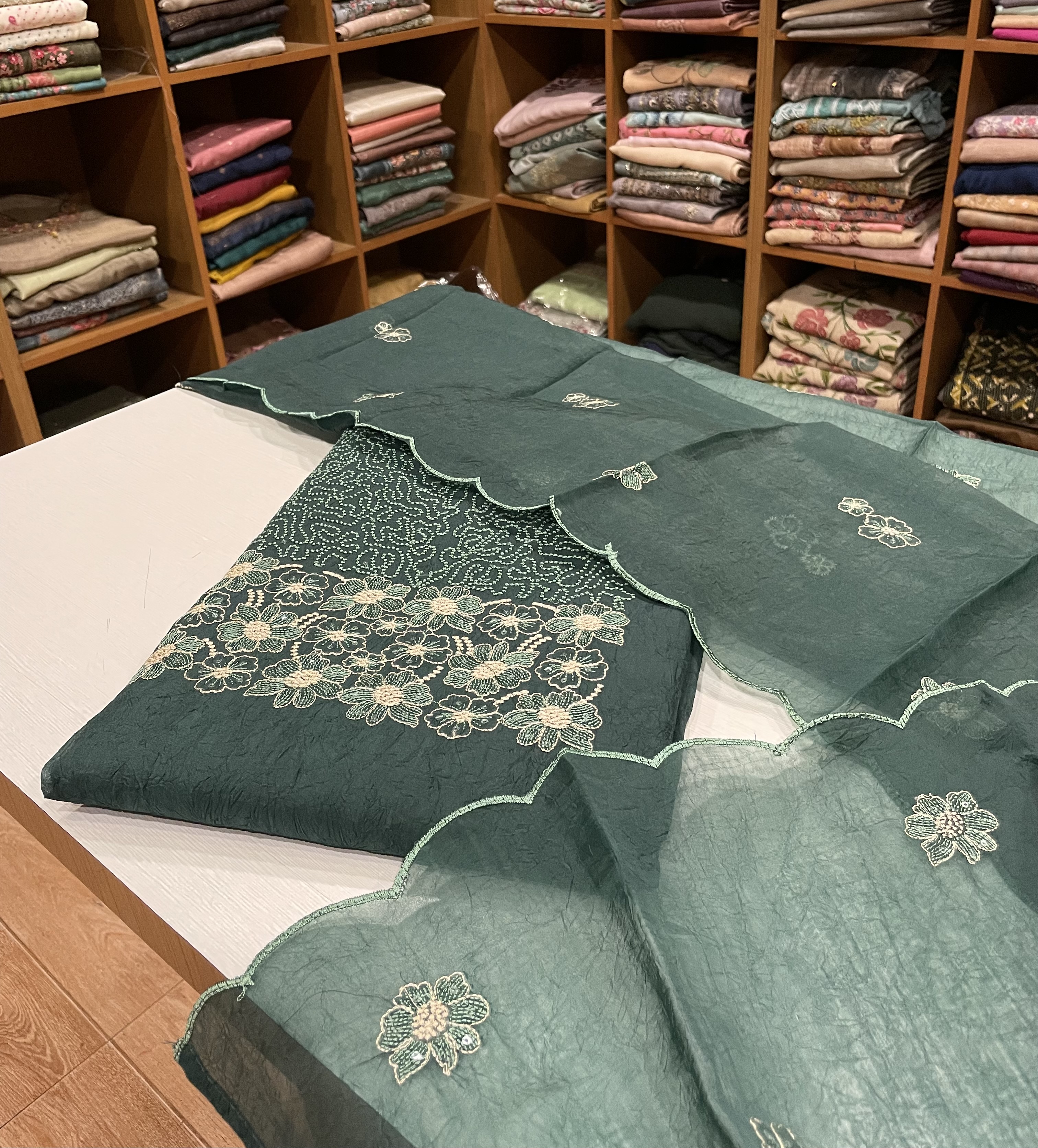 CH Dark Green Crushed Organza Top , Shantoon Bottom & Crushed Organza Dupatta