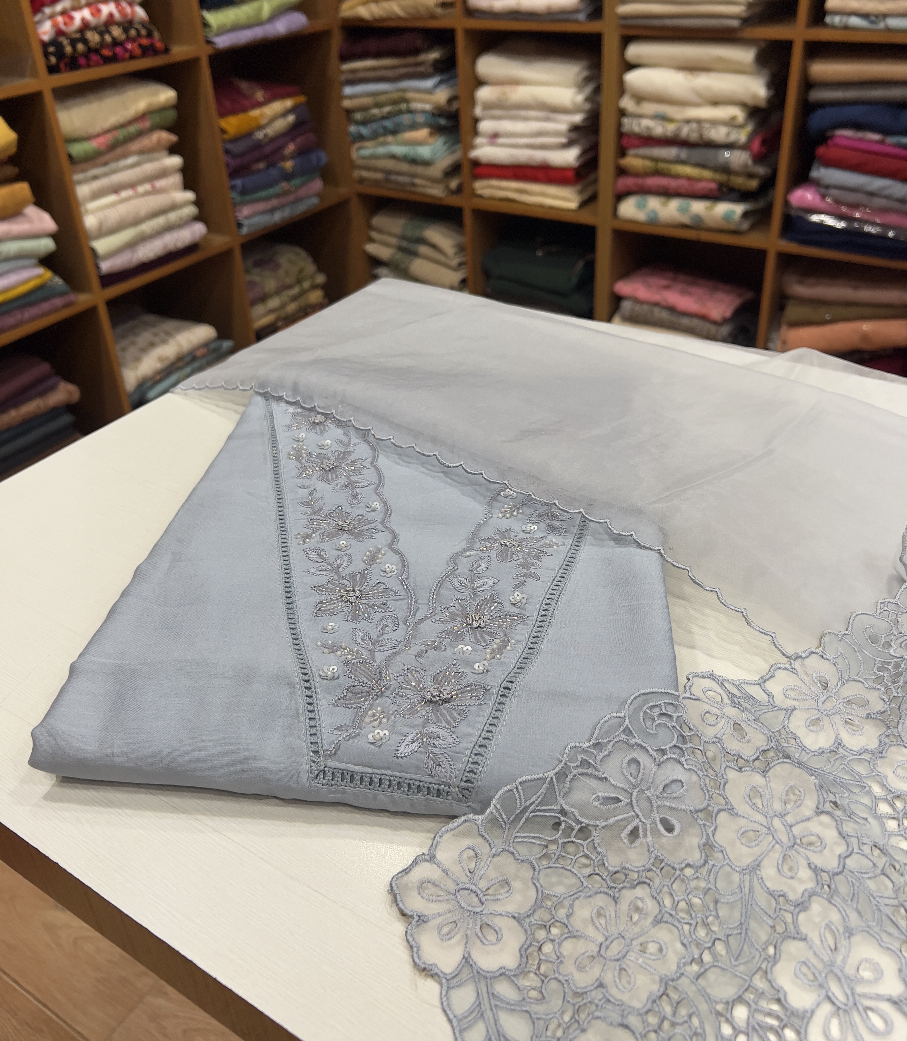 CHU23 Chanderi Top , Shantoon Bottom & Organza Cut Worked Dupatta