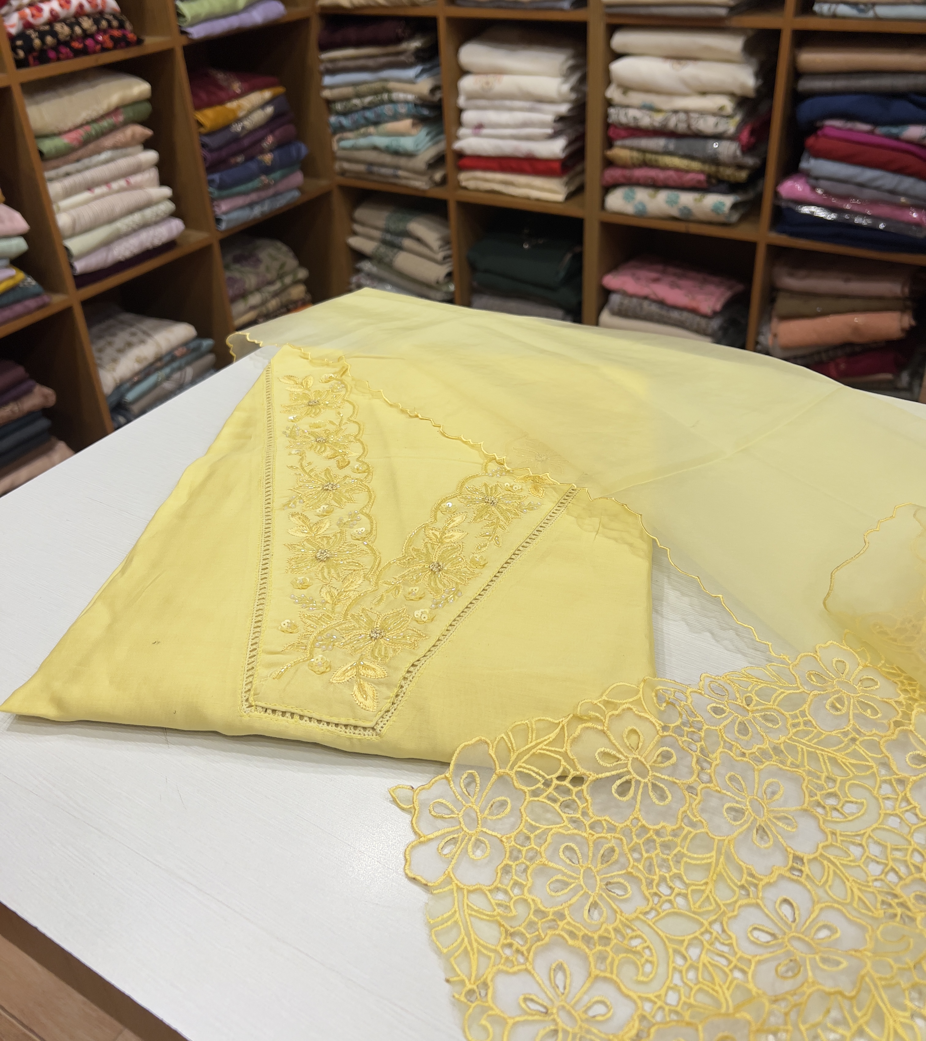 CHU23 Chanderi Top , Shantoon Bottom & Organza Cut Worked Dupatta