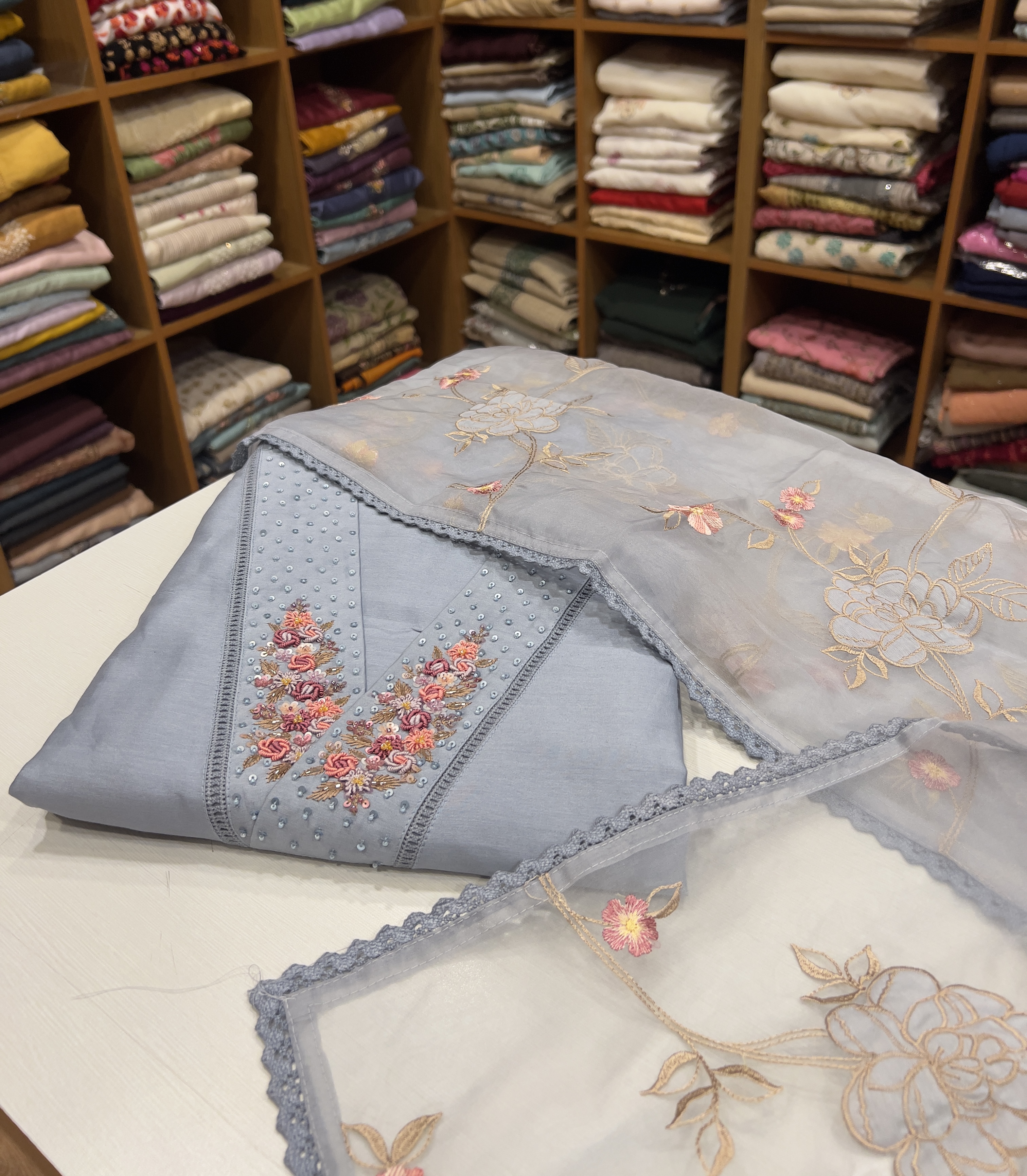 CHU24 Chanderi Top , Shantoon Bottom & Embroidered Organza Dupatta