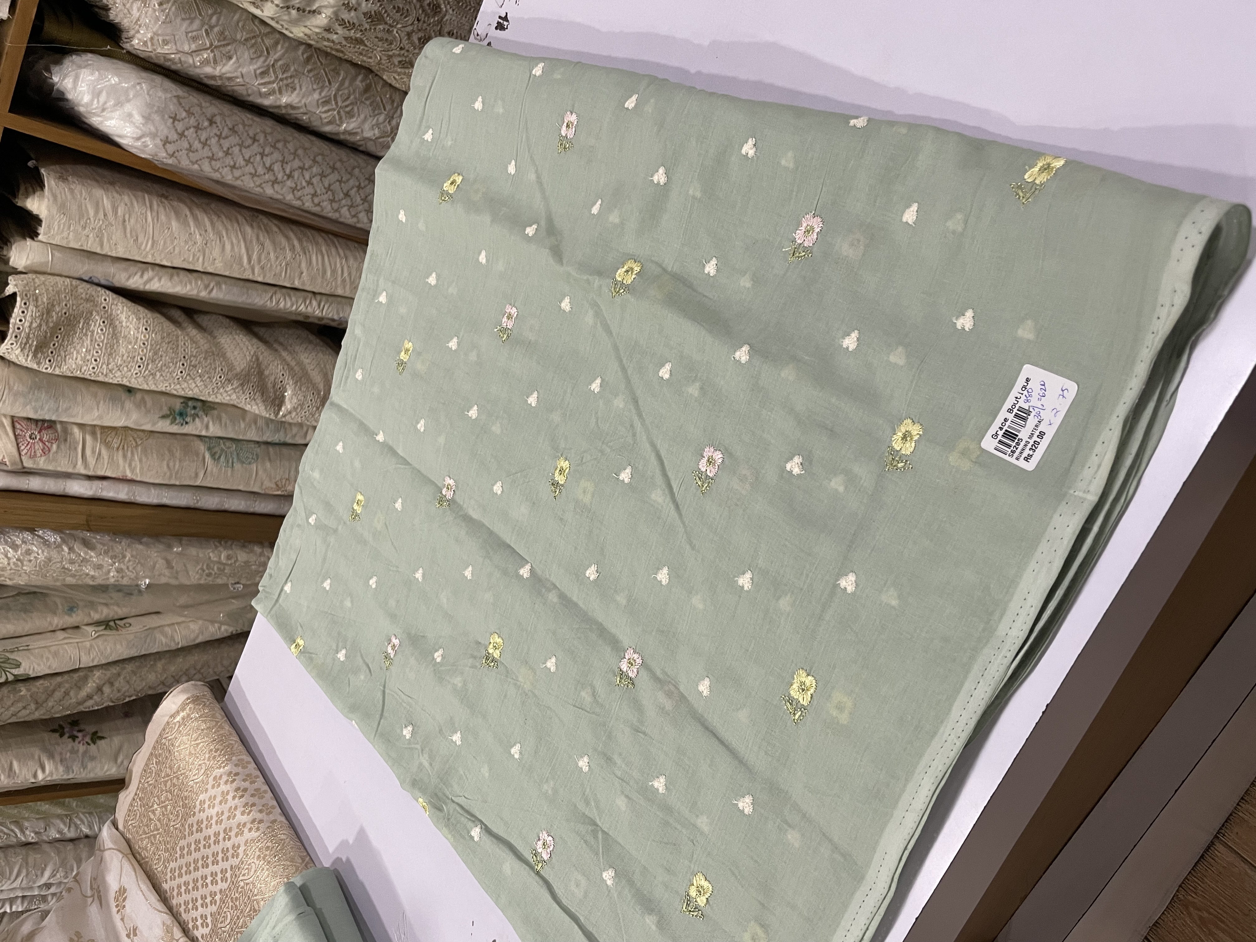 CUT - Sage Green Embroidered Mul Cotton Last Piece 2.75 Mtr