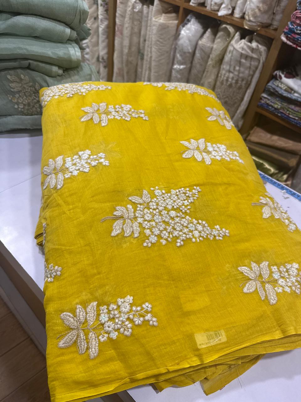 CUT2 - Embroidered Mul Chanderi (Mustard Yellow) Last Piece 2.50 Mtr